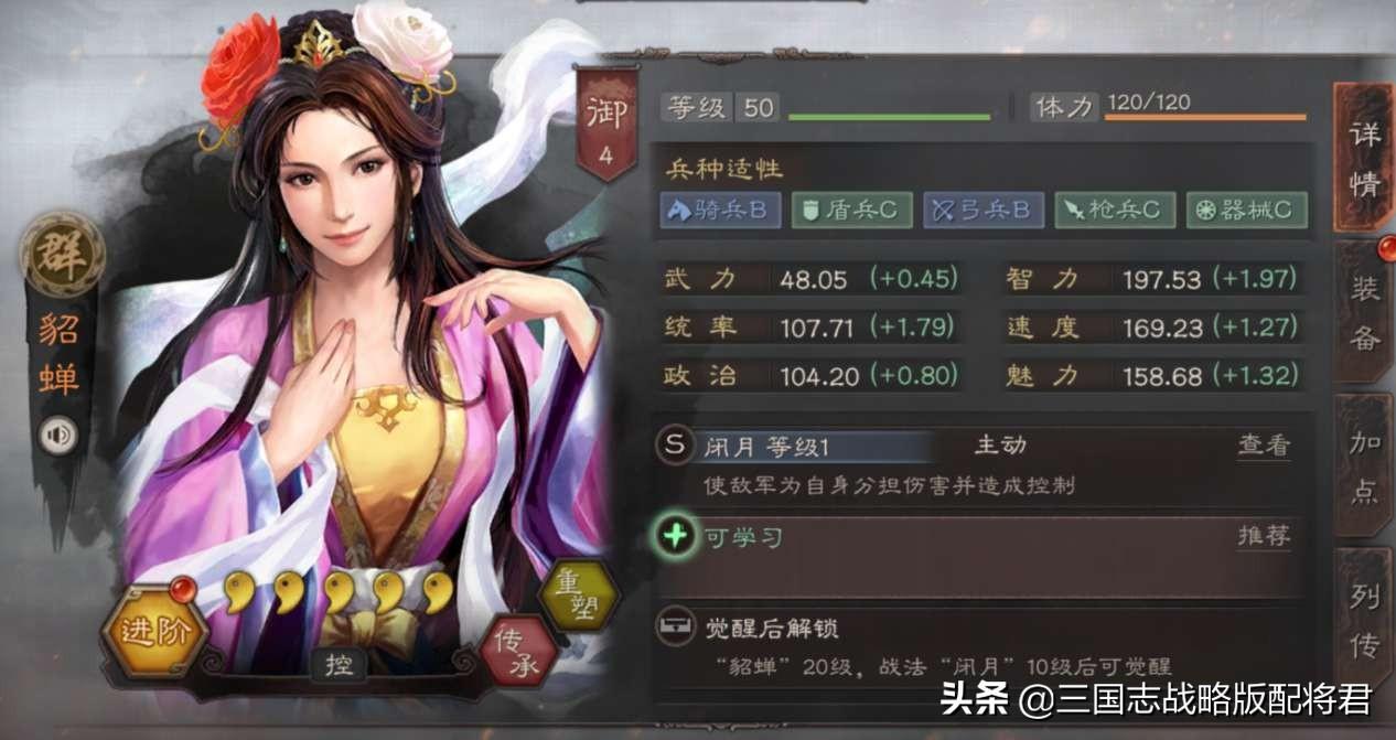 貂蝉与甄姬、大乔、小乔不同,她在游戏中是妥妥的控制型武将,而且效果四维很不错 。但比不上孙尚香、马云禄这些女将,所以只有骑兵和弓箭兵是B级的,兵种属性只有三星武将的水准,幸好智力、统帅、速度这三个属性非常高,所以等级高以后她的属性不会差太多。