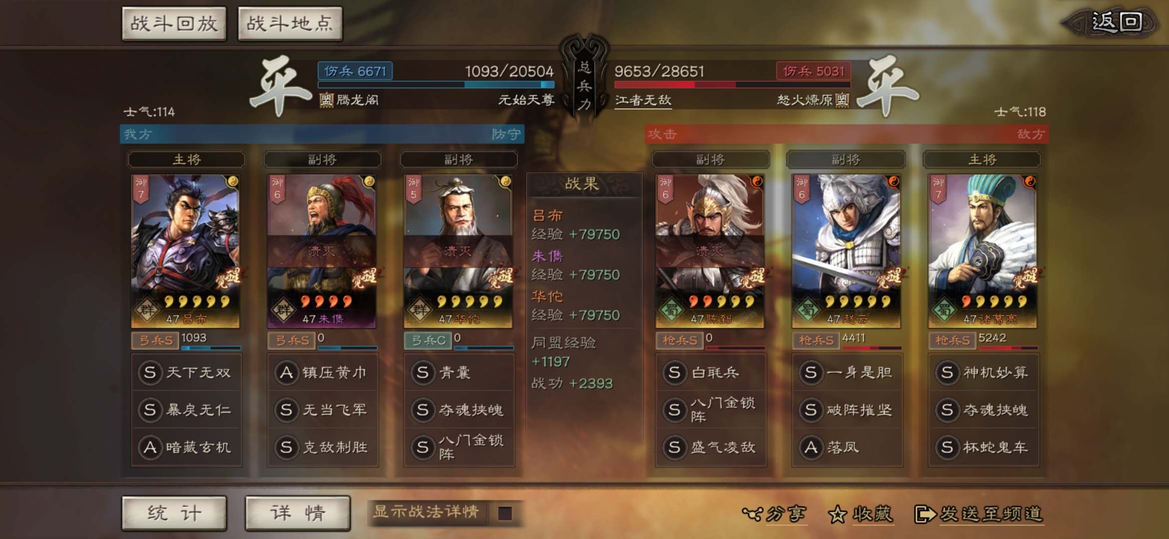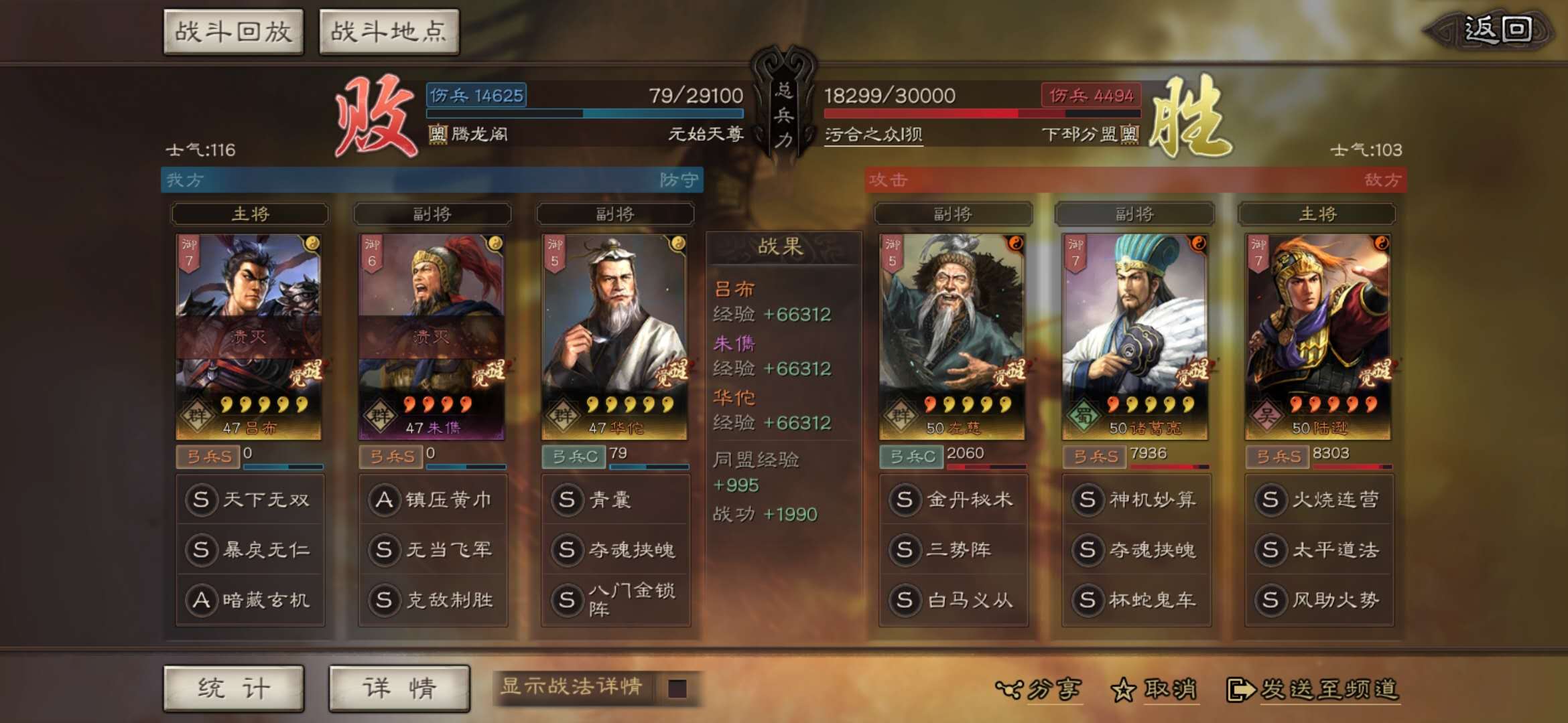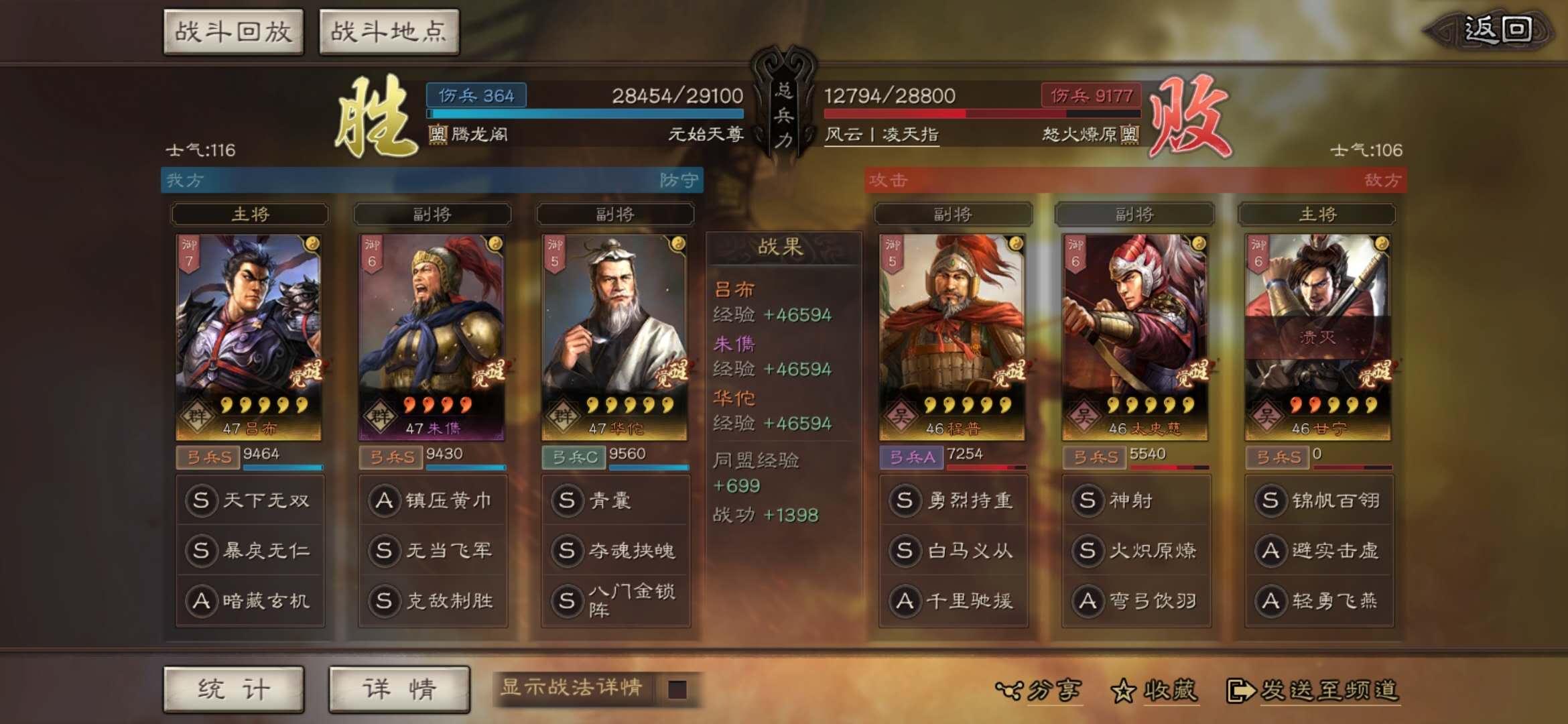 战法搭配如图,吕布(暴戾无仁+暗藏玄机)+朱儁(无当飞军+克敌制胜)+华佗(夺魂摄魄+八门金锁)。战法都是比较常见的几种,相信玩了一段时间豹子头零冲和微氪玩家都能凑齐,思路很明确,低配布儿看脸输出(当然我这个是带了无双画戟的),神将老朱稳定镇压黄巾,无当配合克敌再打一波输出和控制,华爷爷治疗、虚弱、减伤多面手。接下来上战报,多图来袭,注意流量规避。