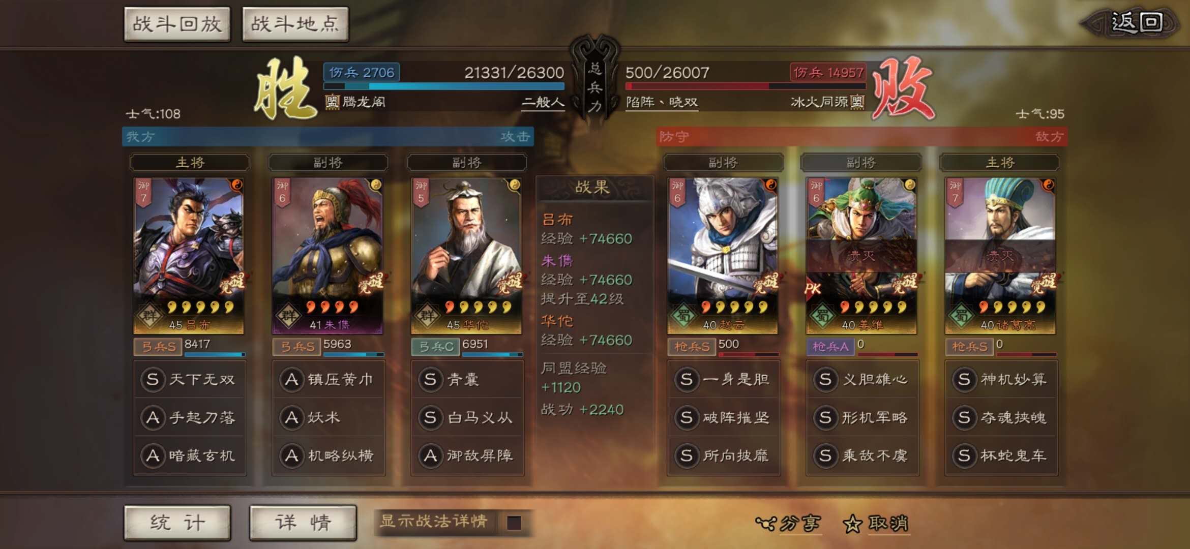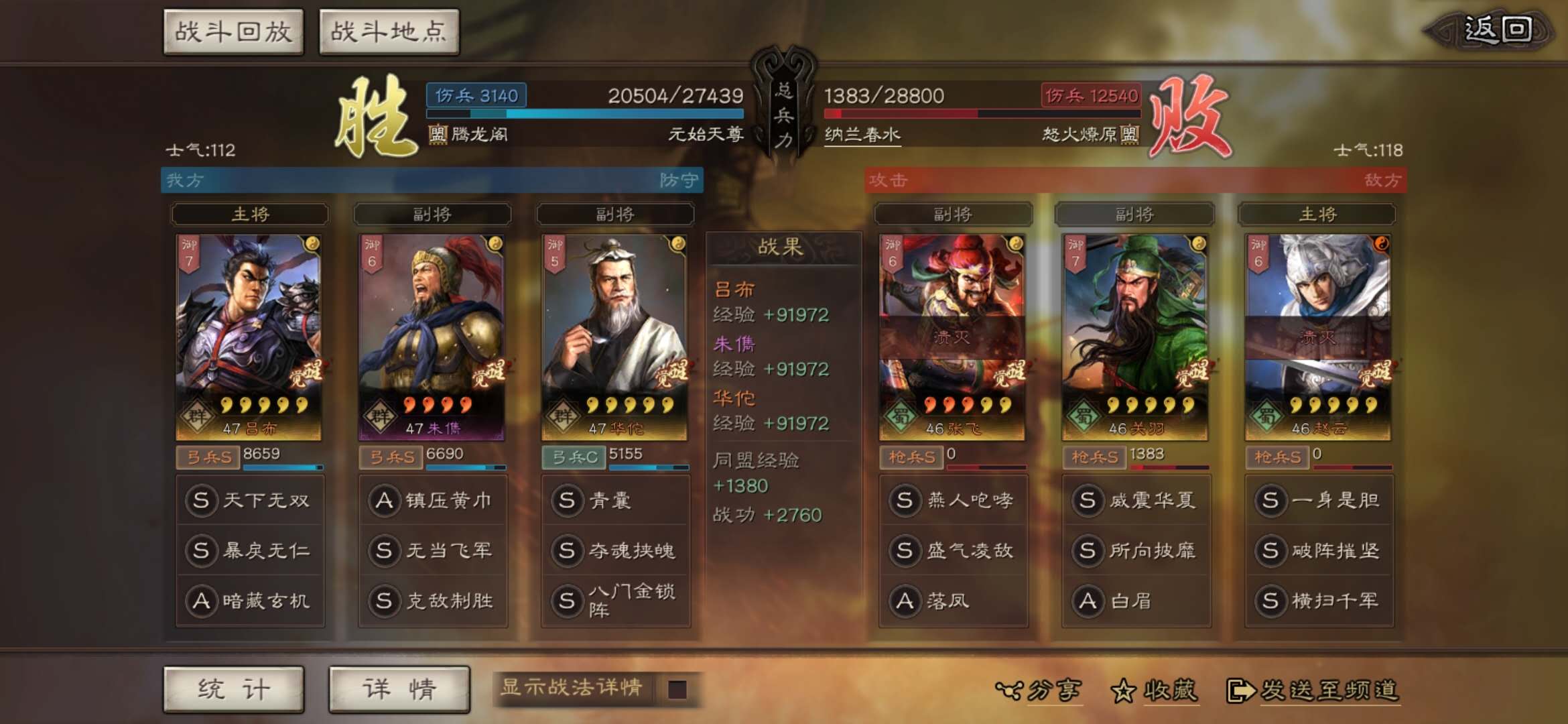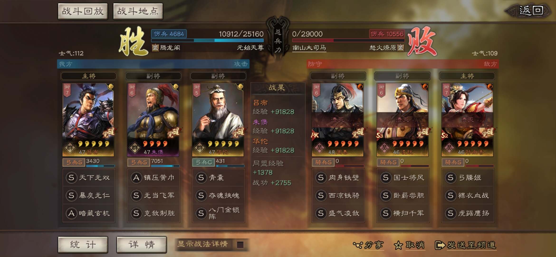 战法搭配如图,吕布(暴戾无仁+暗藏玄机)+朱儁(无当飞军+克敌制胜)+华佗(夺魂摄魄+八门金锁)。战法都是比较常见的几种,相信玩了一段时间豹子头零冲和微氪玩家都能凑齐,思路很明确,低配布儿看脸输出(当然我这个是带了无双画戟的),神将老朱稳定镇压黄巾,无当配合克敌再打一波输出和控制,华爷爷治疗、虚弱、减伤多面手。接下来上战报,多图来袭,注意流量规避。