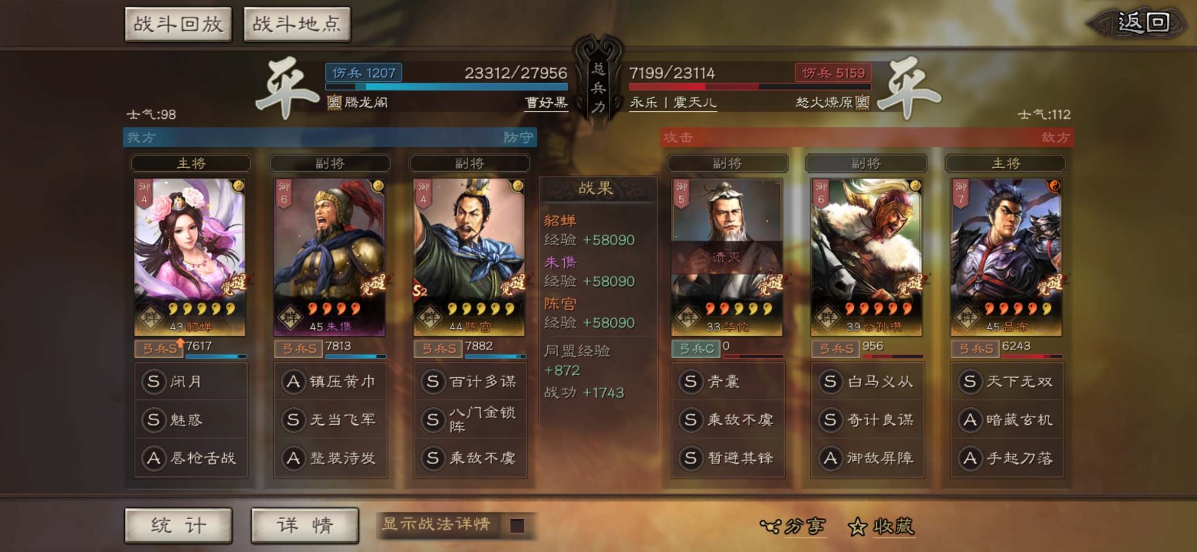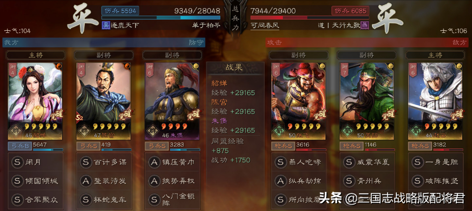 总结:从这个队伍的配置来说,肯定不可能是主力队伍,基本上就是3-5队伍才可能组起来的队伍,最终面对一些主流的T1或者满红队伍也完全不虚,虽然由于输出伤害比较乏力导致容易出现战平的情况,可也不容易出现白给的情况,貂蝉经常各种控制把对方限制的死死的,个人感觉魅惑才是貂蝉的最强控制战法,如果带上这个战法在强度方面还能提升,获取难度也不会太高。最关键的是,这个队伍保底也有刮痧伤害,不容易出现0战损给对手白送战功的情况,如果有一定红度并且喜欢黑科技的朋友在赛季末的时候可以玩一玩,全当娱乐别当主力来玩还是可行的!