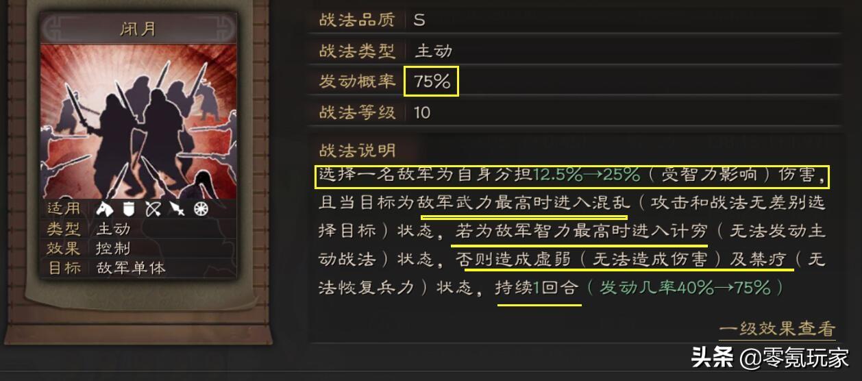 整体来说,这个战法算3个效果,免伤、伤害、控制三种效果融为一体,对付敌人时候除了控制效果是随机的,免伤和伤害都比较稳定。