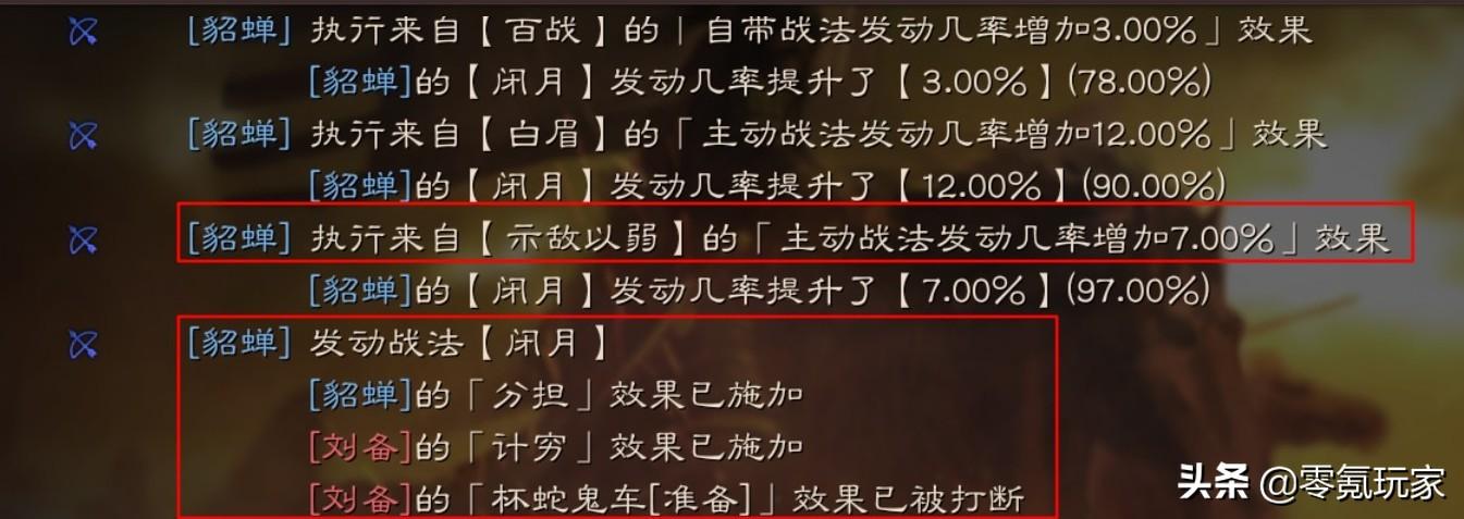 由于队伍经常打到5回合以后,而且容易打平,所以用示敌以弱,削弱貂蝉的输出,增加5回合时貂蝉的战法发动概率7%。