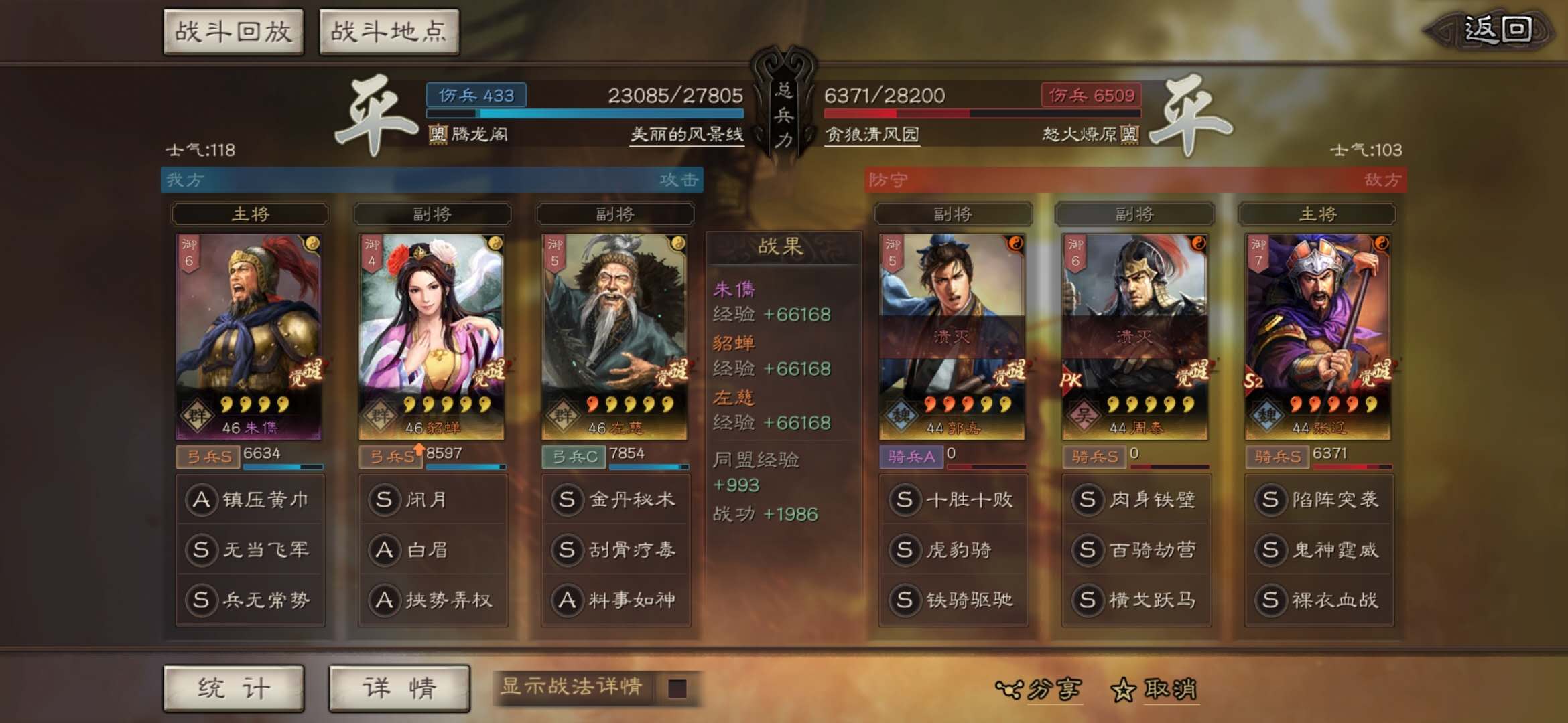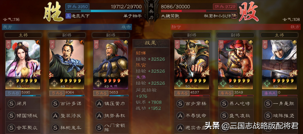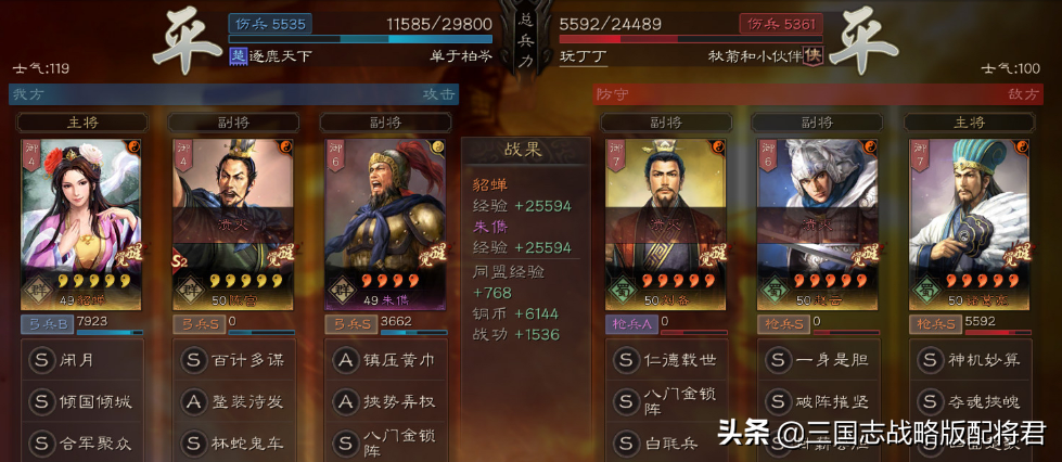 似乎很少有人用貂蝉与他们搭配,“六弦”在手里没有好武将的情况下试了试这个队伍,结果发现意外的好用。