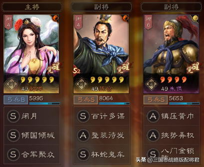 貂蝉(魅惑+唇枪舌战)+朱儁(无当飞军+整装待发)+陈宫(八门金锁+乘敌不虞)这个组合与上一个有着异曲同工之妙,但战法要求更低,两个A级加几个常见S级战法对大部分玩家来说问题都不大,组一队挑着打还是有不菲收获的。
