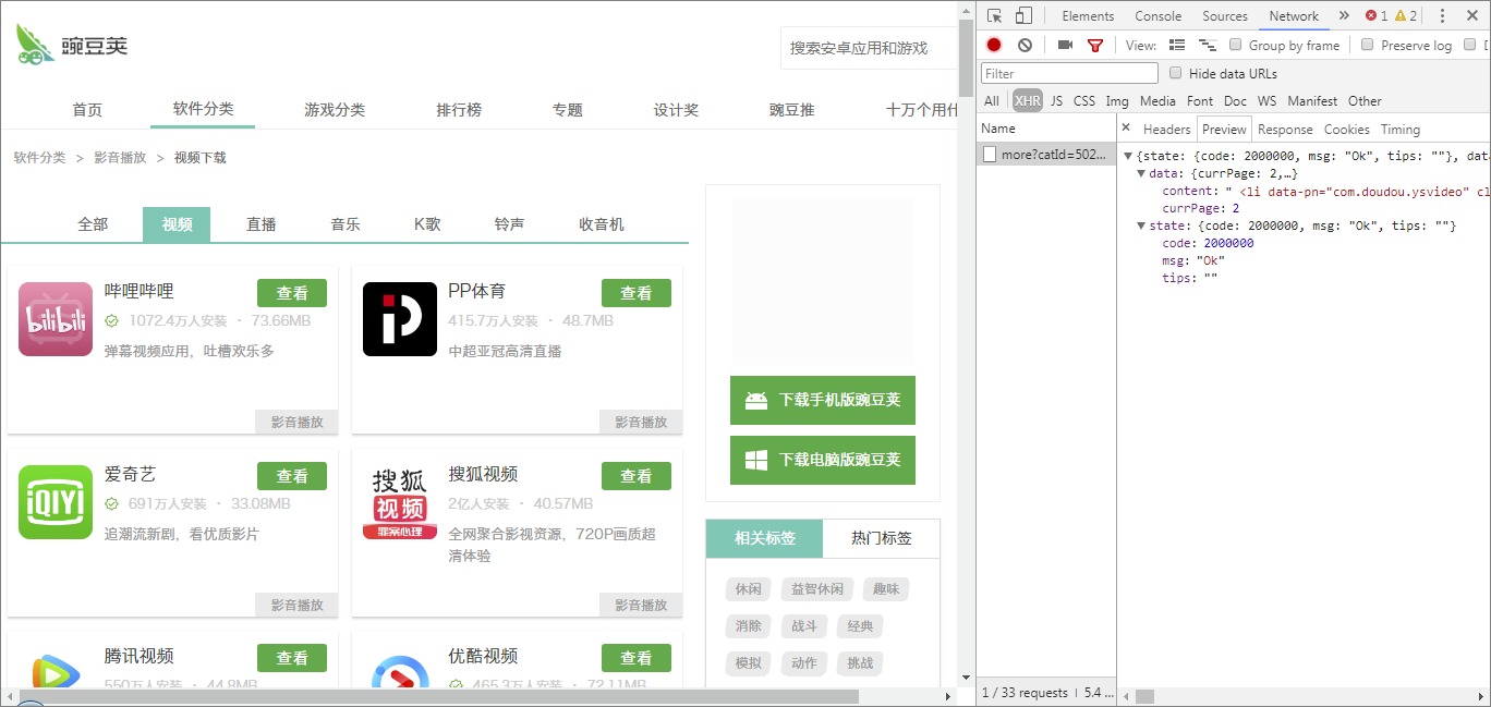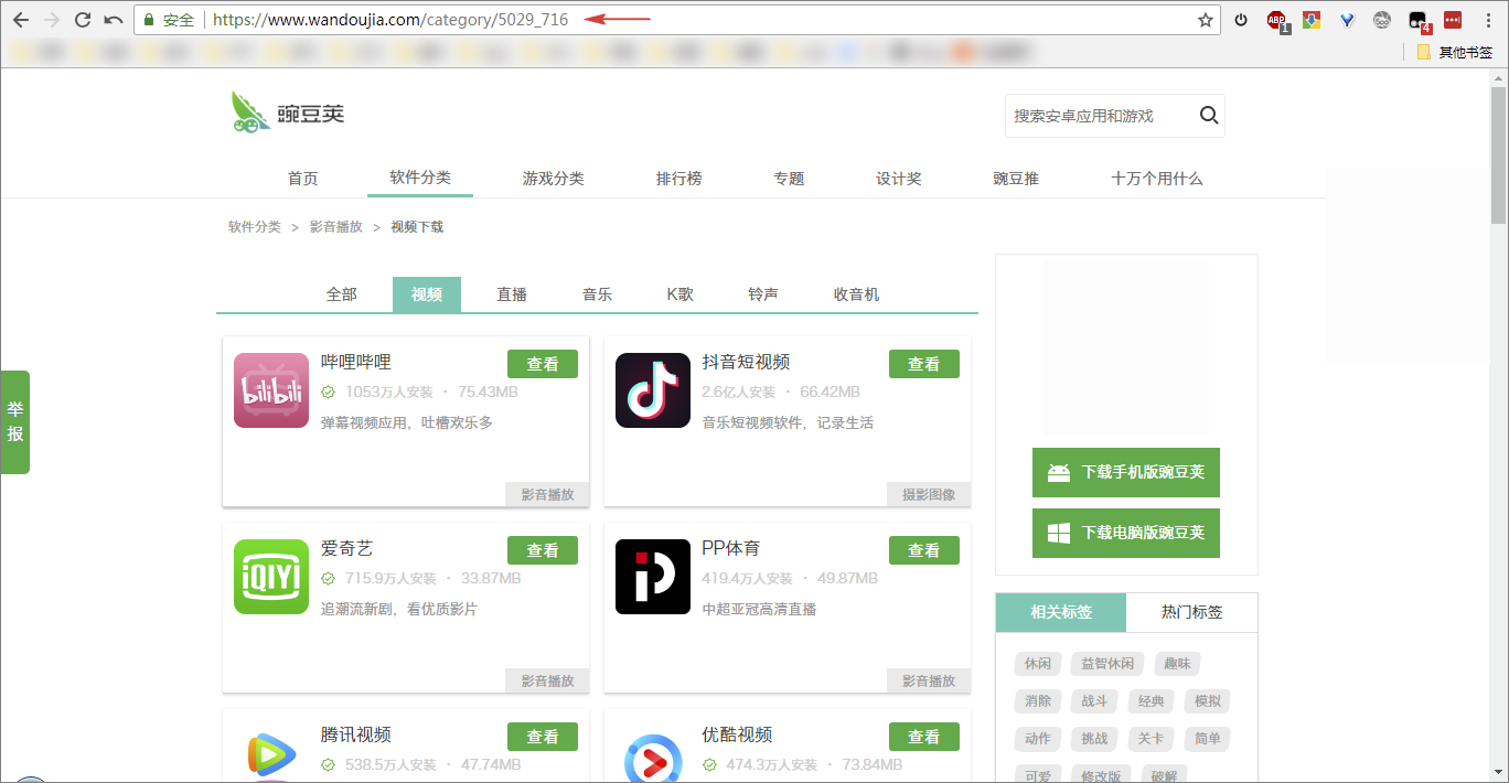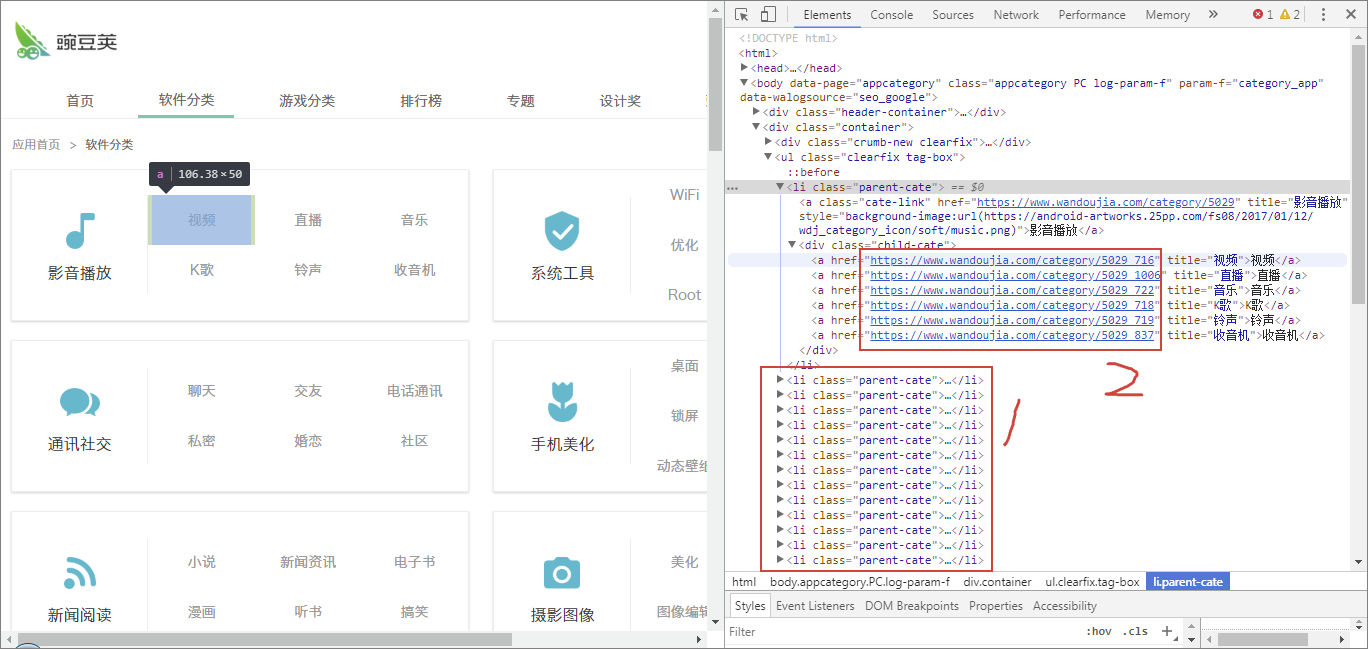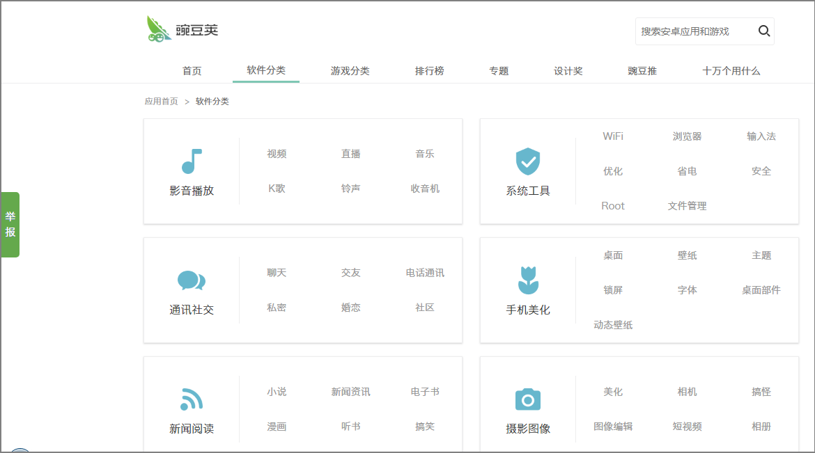 首先,我们先来了解一下要抓取的豌豆荚网页是什么样的,可以看到该网站上的 App 分成了很多类,包括:「应用播放」、「系统工具」等,一共有 14 个大类别,每个大类下又细分了多个小类,例如,影音播放下包括:「视频」、「直播」等。
