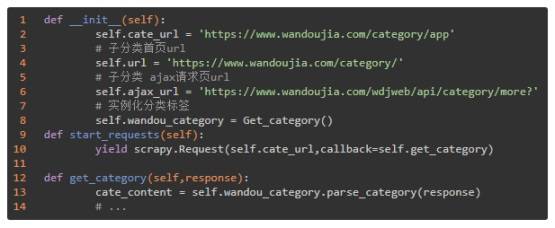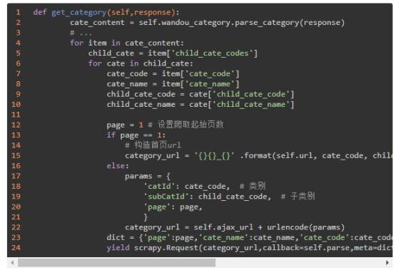 程序从 start_requests 开始运行,解析首页获得响应,调用 get_category 方法,然后使用 Get_category 类中的 parse_category 方法提取出所有 URL,具体代码如下: