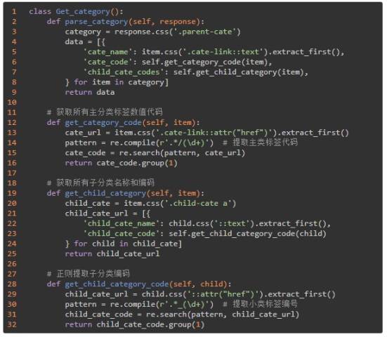 这里,除了分类名称 cate_name 可以很方便地直接提取出来,分类编码和子分类的子分类的名称和编码,我们使用了 get_category_code 等三个方法进行提取。提取方法使用了 CSS 和正则表达式,比较简单。