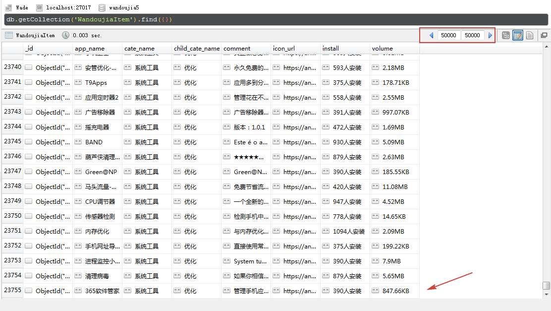 最后,parse 方法用来解析提取最终我们需要的 App 名称、安装量等信息,解析完成一页后,page 进行递增,然后重复调用 parse 方法循环解析,直到解析完全部分类的最后一页。