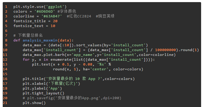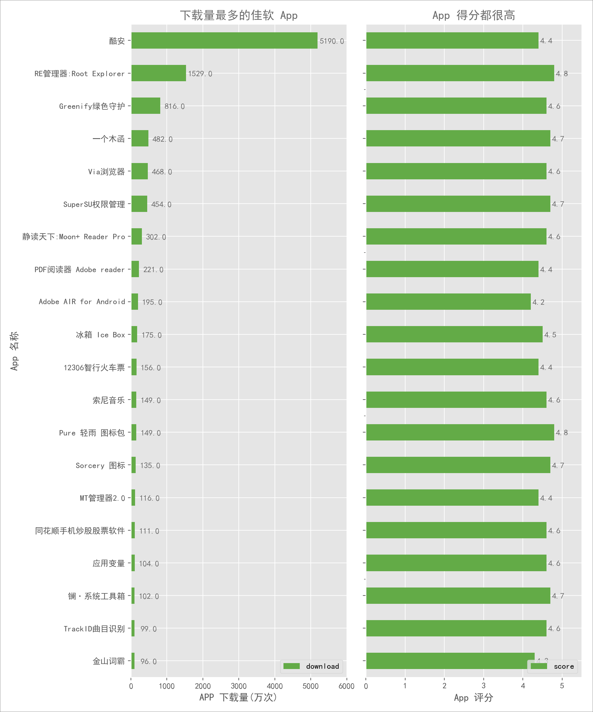 首先来看一下 App 的安装量情况,毕竟 70000 多款 App,自然很感兴趣 哪些 App 使用地最多,哪些又使用地最少 。