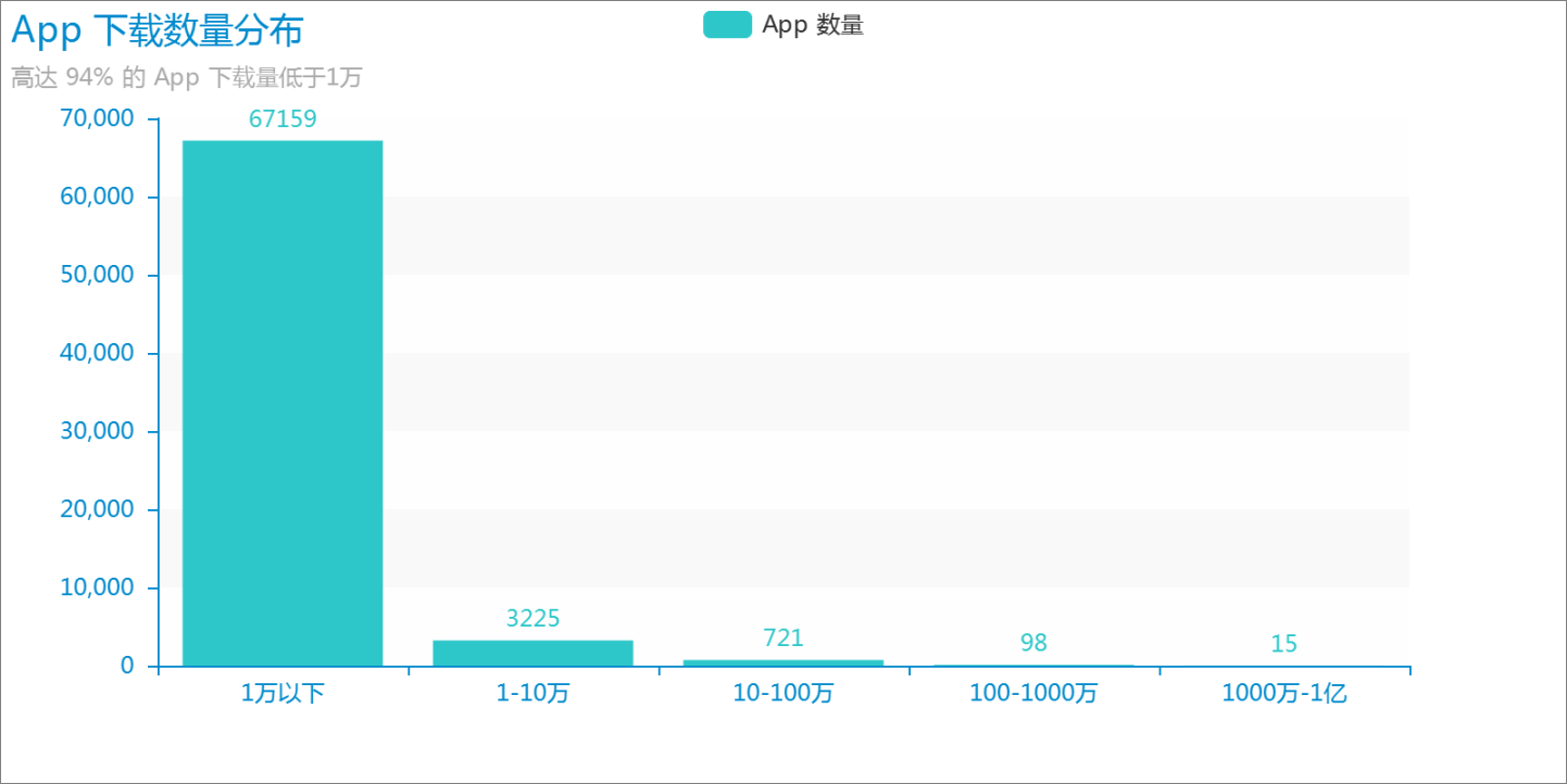 很惊讶地发现,竟然有 多达 67,195 款,占总数的 94% 的 App 的安装量不足 1万!