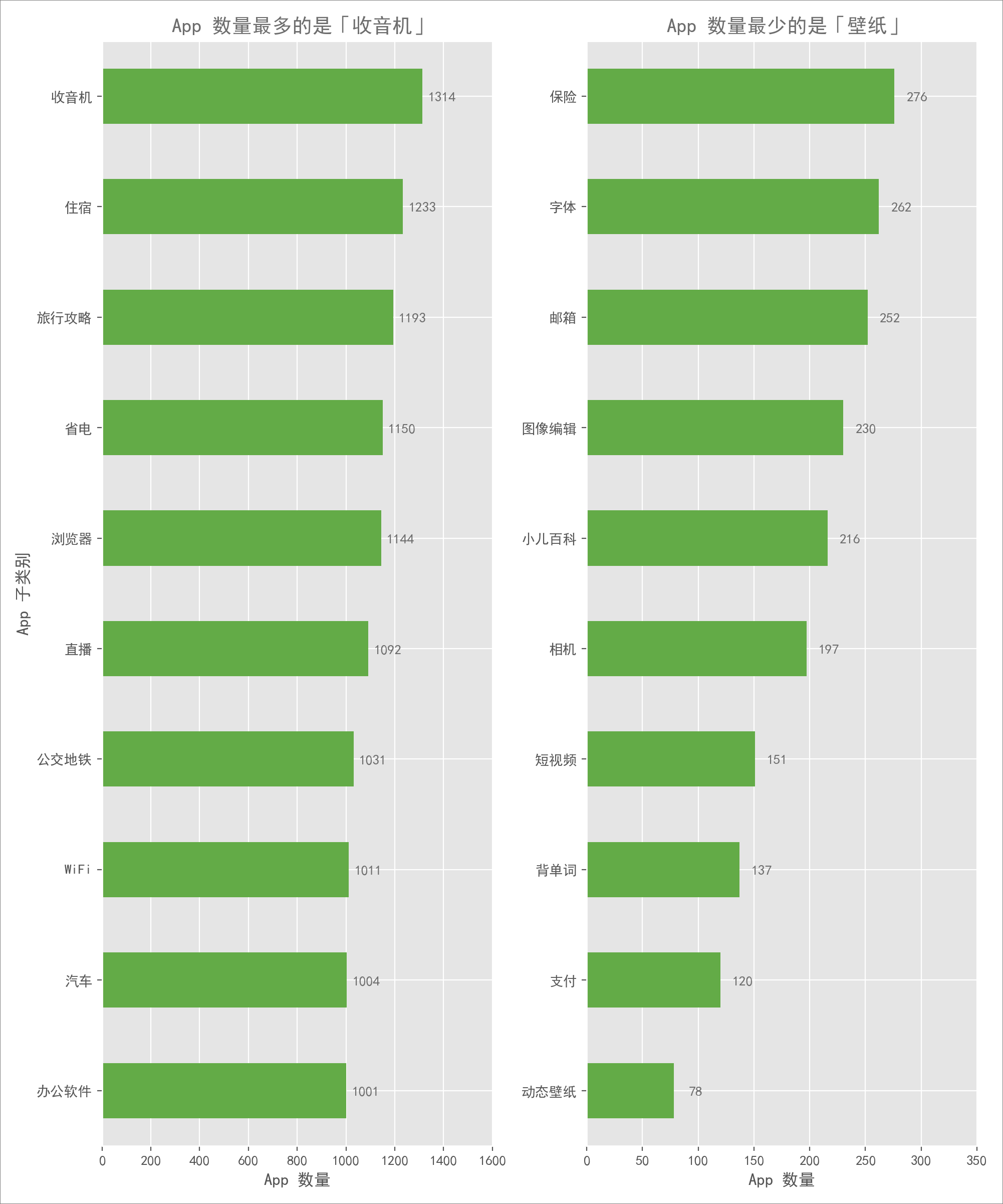 接着,我们进一步看看 88 个子分类的 App 数量情况,筛选出数量最多和最少的 10 个子类: