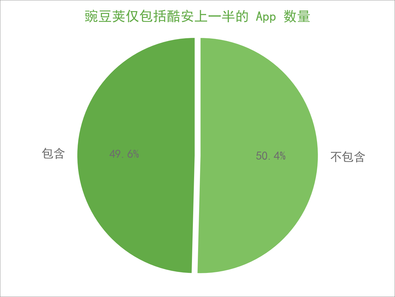 如果是,「你有的我都有,你没有的我也有」,那么酷安就没什么优势了。统计之后,发现豌豆荚 仅包括了 3,018 款,也就是一半左右 ,剩下的另一半则没有包括。