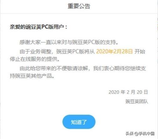 2月20日,豌豆荚团队发布公告称,由于业务调整,豌豆荚PC版将从2020年2月28日开始停止在线服务的提供。