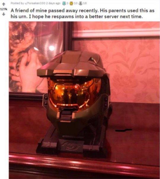 绝症让这位玩家生命走到了尽头,他向父母留下遗言“将自己的骨灰葬在士官长的头盔中”,他的父母在他死后含着泪照做,专门做了一个“士官长头盔”样子的骨灰盒,并将他的骨灰放到里面。