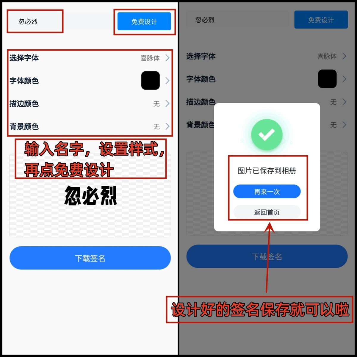 第二步,在文本框里面输入自己的名字,选择字体,颜色和背景等等,点击【免费生成】开始设计,设计好之后下载签名就可以保存了。