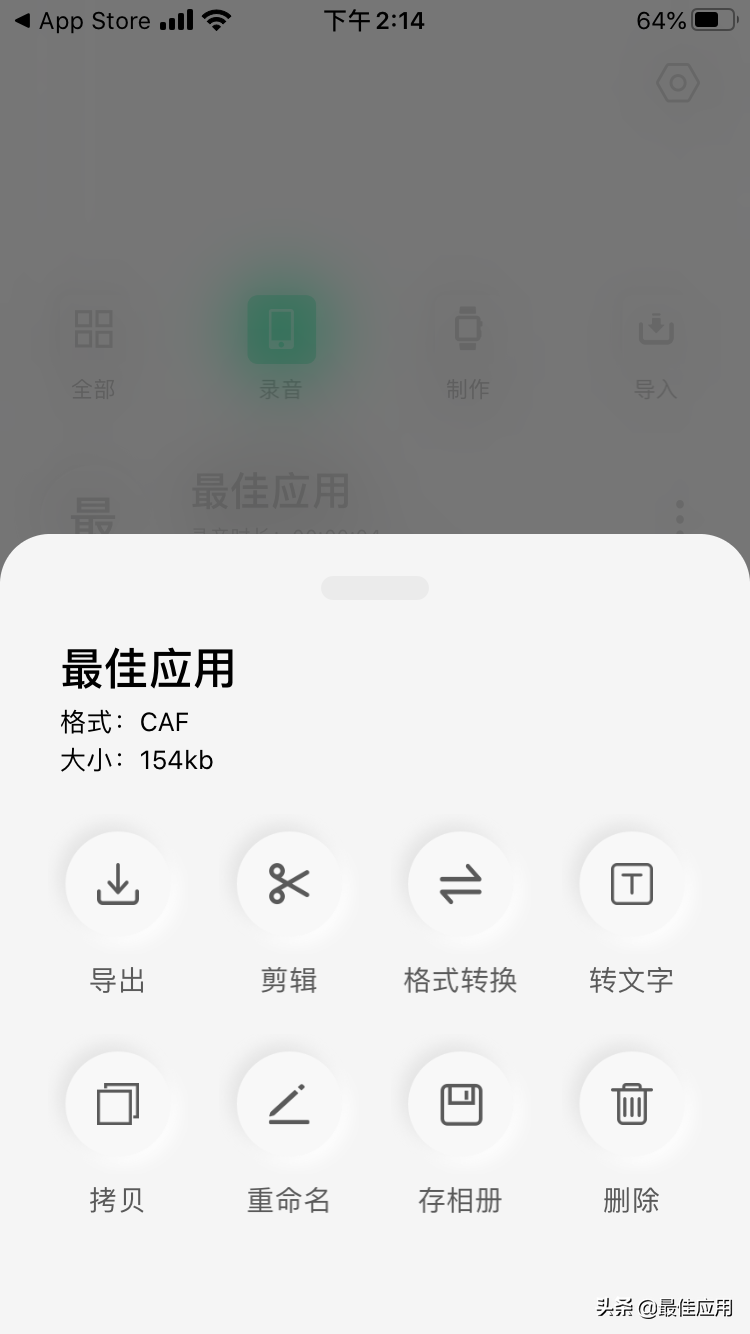 软件录制好的声音格式默认为CAF,你可以将其转换为MP3、M4A等格式,这个根据自己需求去转换即可,一般来说MP3最为普遍。
