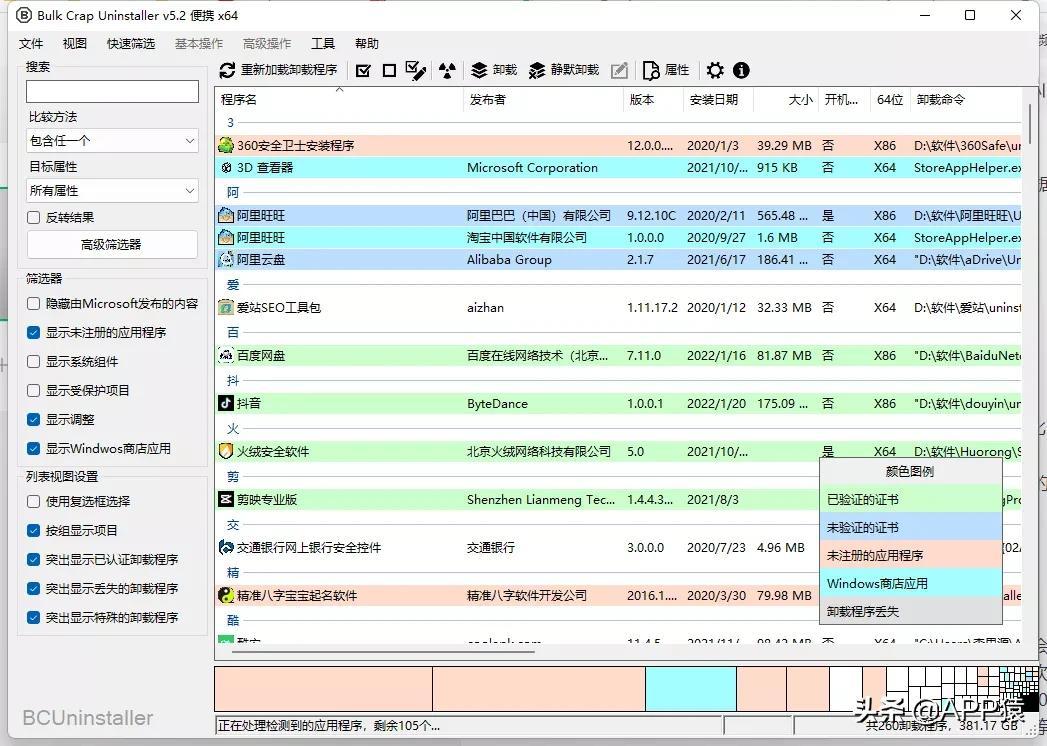 【Bulk Crap Uninstaller】是一款批量程序卸载删除工具,它比系统自带的卸载程序要更强,因为它能够扫描和删除卸载残留,也就能够把程序彻底卸载,另外还有启动项管理、清理Program Files文件夹。但要注意的是进入界面默认是英文的,需要在设置中把语言调成中文。