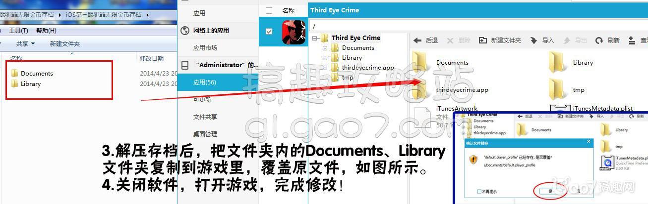 3、解压存档后,把文件夹内的Documents、Library文件夹复制到游戏里,覆盖原文件,如图所示。