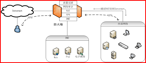 通过部署和使用防火墙,不但可以贯彻执行单位的整体安全策略防止外部攻击,还可有效地隔离不同网络,限制安全问题扩散,也可有效地记录和审核Internet上的活动。