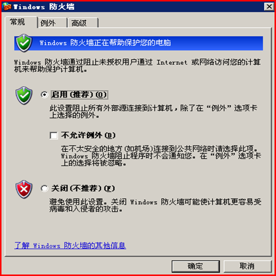需要对外提供服务时,取消【不允许例外】复选框,在【例外】选项卡中的程序或端口允许被访问,不在【例外】选项卡中的程序和端口不允许被外界访问。