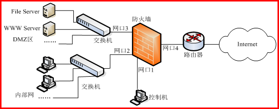 使Internet与Intranet之间建立一个安全网关(Security Gateway),从而保护内部网免受非法用户入侵,简单部署如图5-2所示。