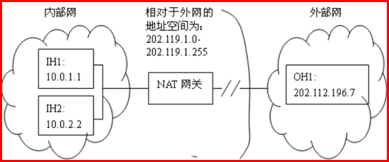 内部网使用虚拟地址空间为10.0.0.0~10.255.255.255,对外拥有注册真实IP地址为202.119.1.0 ~202.119.1.255,内部主机IH1、IH2地址分别设为10.0.1.1和10.0.2.2,另一外部网主机OH1地址为202.112.196.7,网络拓扑结构如图5-11所示。