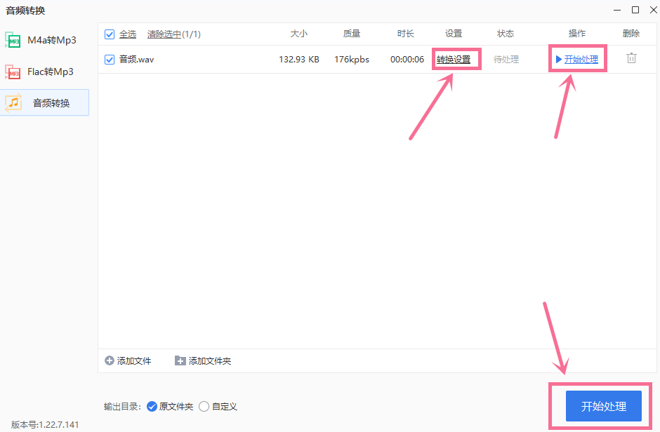 点击“转换设置”,弹窗中,大部分音频格式都有,对素材音质不满意还能进一步优化,最后,决定音频输出的文件目录,点击“开始处理”,结束转换步骤。