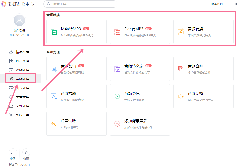 三款中最为突出的编辑软件,功能完善,操作简洁,具体转换操作如下,首先,在软件界面左边的功能栏中找到“音频处理”,然后使用“音频转换”功能,将准备好的素材导入。