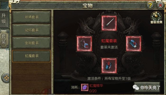 看世界杯的同时别忘了还有《传奇3复古版》哦休闲娱乐两不误!今天将给大家带来玩法介绍之宝物篇一起来看看玩法介绍1、服务器达到指定开服天数,将会开启「宝物」玩法;2、宝物为宝物套装,宝物套装下面分为多个相应的系列宝物;3、玩家达到相应的等级可以对宝物进行升级;4、宝物达到指定等级可以激活套装属性;5、宝物套装激活后,可以为玩家带来套装效果,套装等级越高,效果越好6、不同的套装会带来不同的套装效果。
