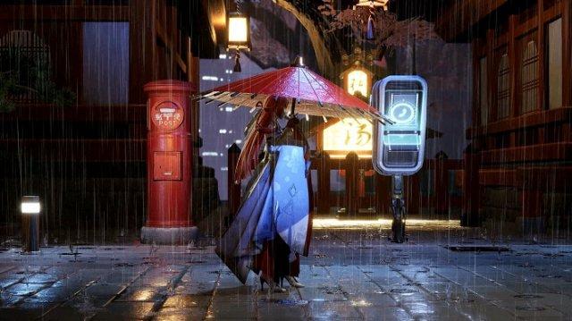 根据现场EPIC高管的介绍,在虚幻4引擎渲染下《代号:夏娃》的物品材质也会实时发生改变。就像视频中下雨时,油纸伞上溅起水花,同时还能清晰的看到伞的褶皱感。而类似淋雨湿身、暴晒出汗这样的设定,也许在游戏中也能体验到。