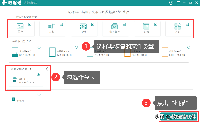 告诉大家一个小妙招:使用数据蛙恢复专家进行数据恢复。这款软件专注各类数据的恢复,除了内存卡外,移动硬盘、u盘等存储设备的数据也是支持扫描和修复的。软件操作简单,可以按下方步骤进行: