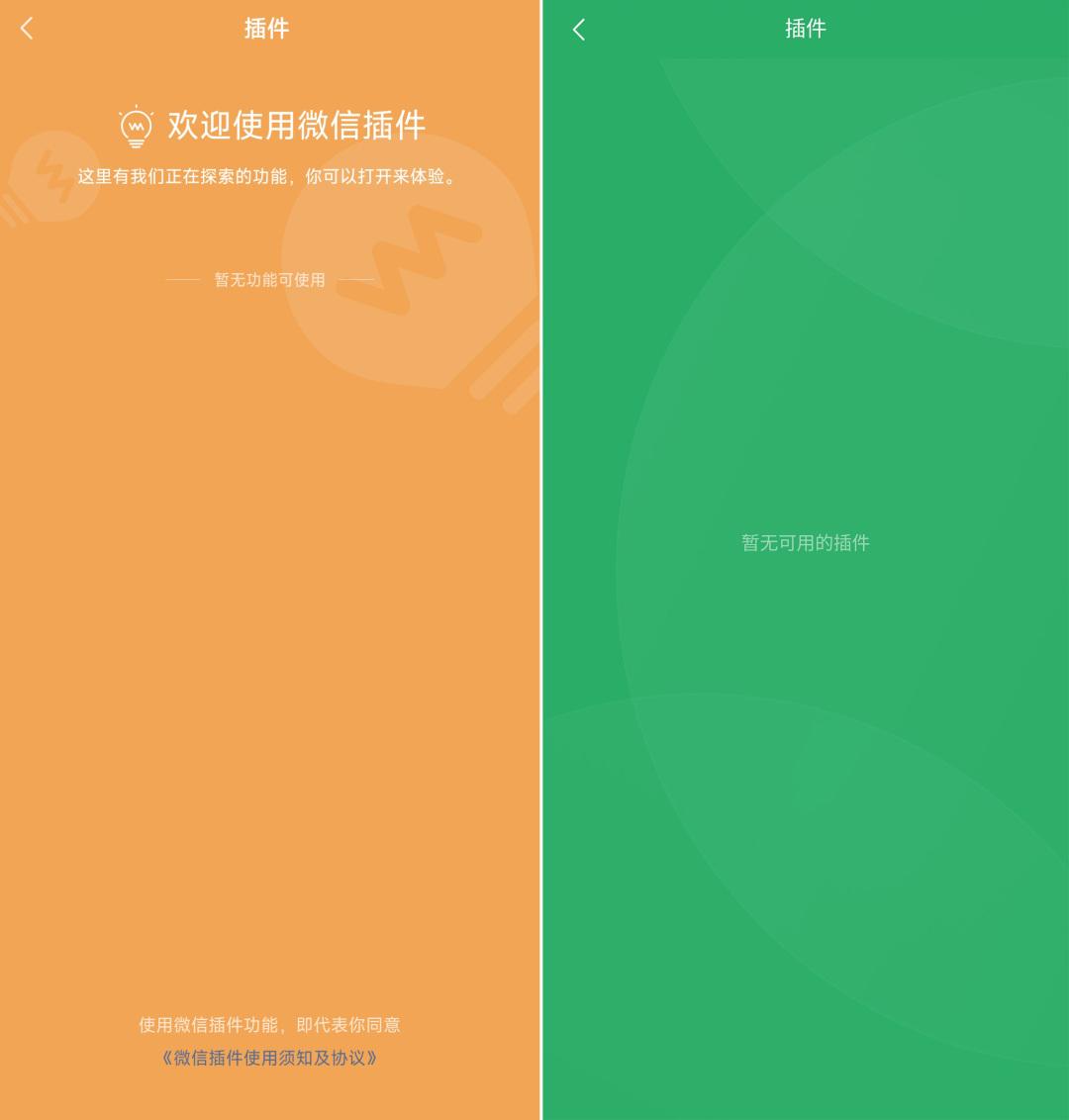 首先是背景颜色,由黄色改为了微信主题色绿色,其次是页面文字内容也有变化,这一界面以往上方和下方的文字都被删除了,仅仅保留了“暂无可用的插件”,而且被移动到了居中位置显示,此外背景图案也有变化。