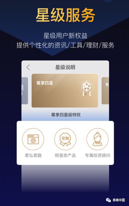 “举个例子,比如一星和二星用户一般是刚刚使用君弘APP或者初入股市,我们为他提供最快的行情,最全的资讯和智能化工具,牛人牛股社区。经过了一二星级的成长和体验,三星用户能够拥有全能账户和策略交易等优质服务,全方位的辅助投资。四星、五星用户则有更多的私人订制、专属客服,还可以根据自己的喜好将界面从时尚简约切换到尊贵黑金版本。实际上,用户升星的过程也是成长的过程,君弘APP希望一路陪伴用户成长。”毕志刚说。