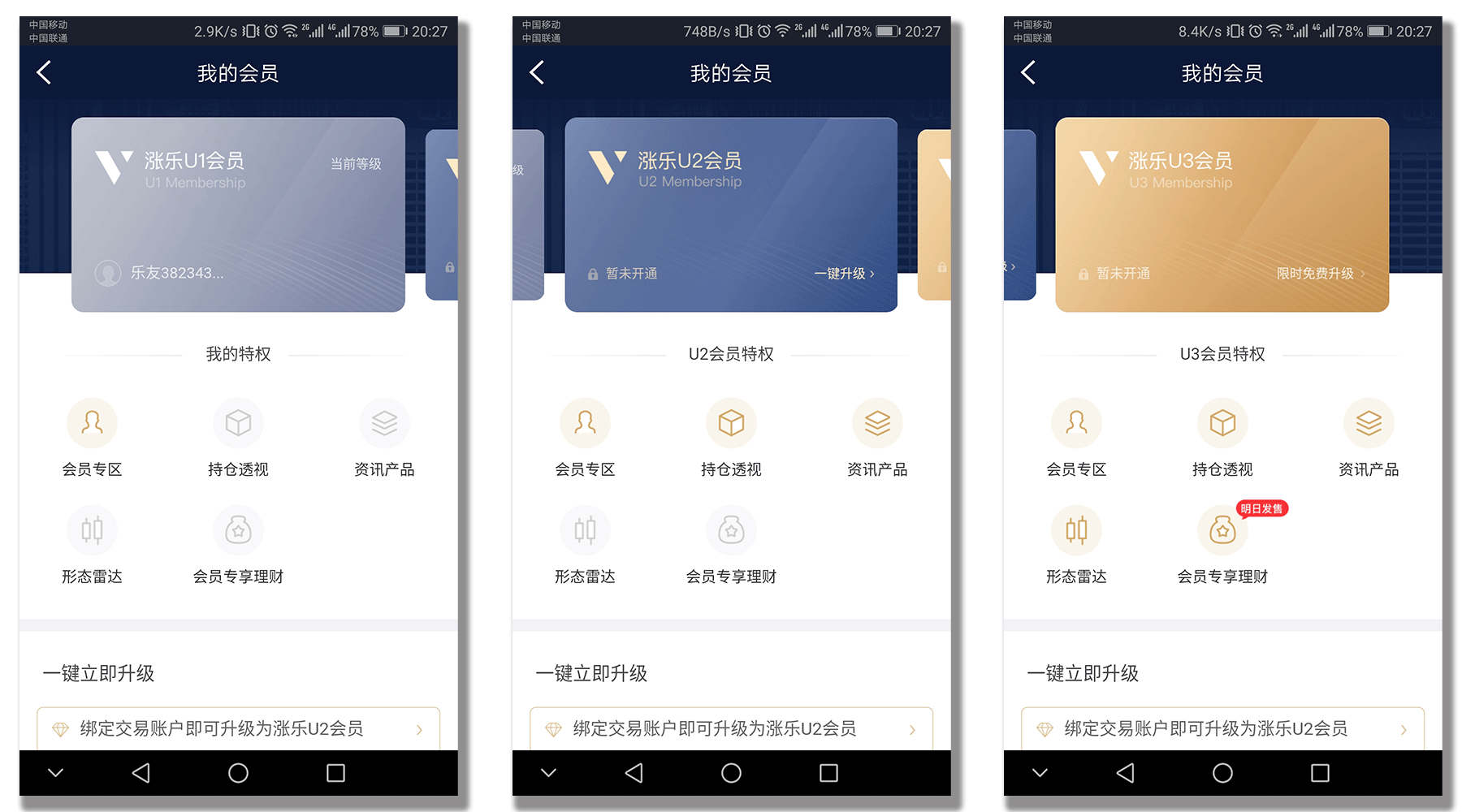 成为U1会员,只需注册涨乐财富通即可,意即所有涨乐财富通非交易登陆客户均可成为UI会员;成为U2会员,则需要完成会员账户与交易账户的绑定,意味着完成开户后的用户均可成为U2会员;成为U3会员,需要花费12元/月,但是目前处于限免时期,可免费使用3个月 。暂无退出规则的介绍。
