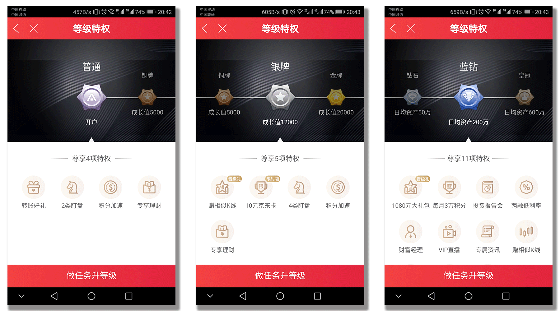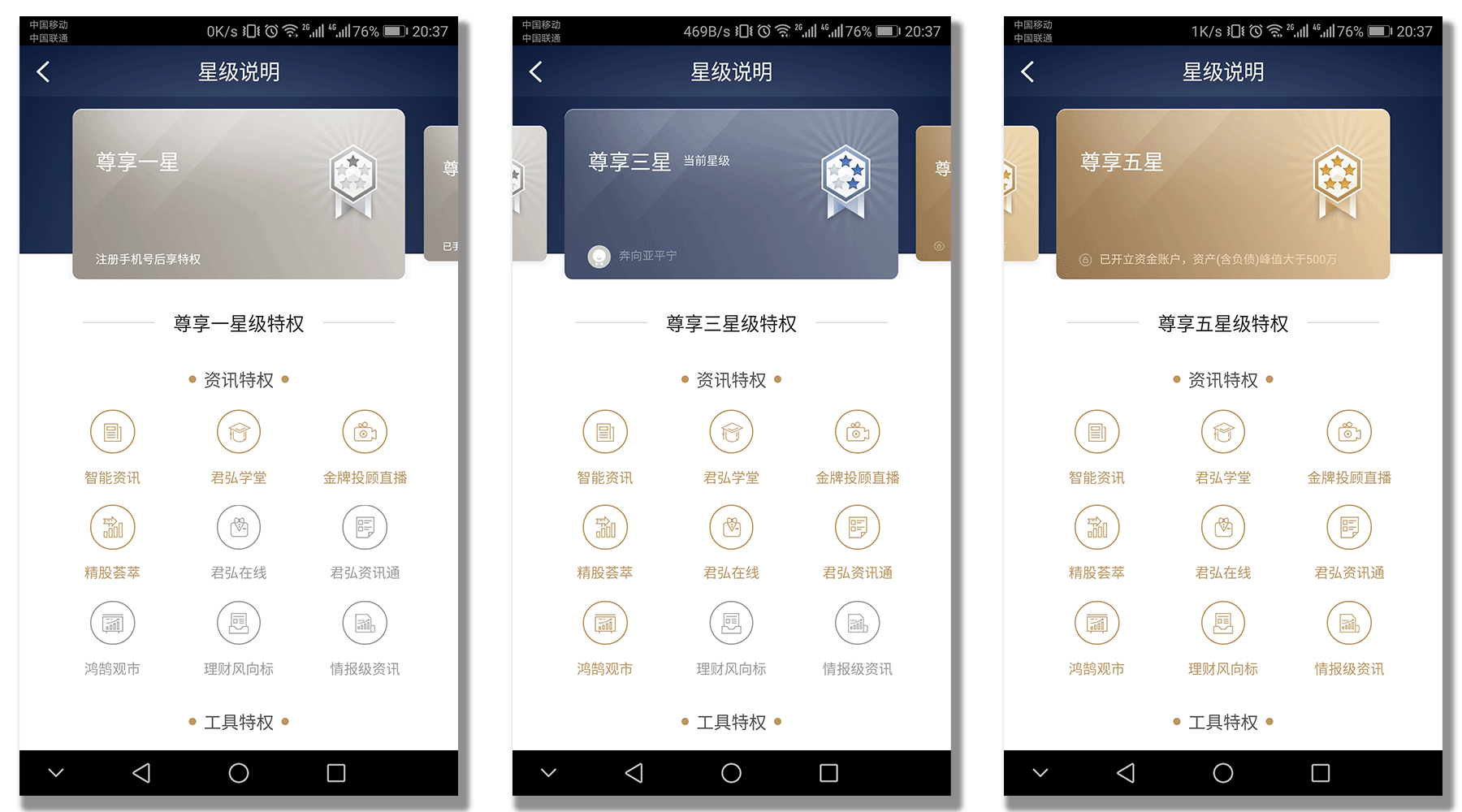 资讯、工具、理财、服务特权按照不同星级权益不同享有福利也不同,客户可在星级权益页面看到自己的特权,并可点击升级自己的星级以获取特权。