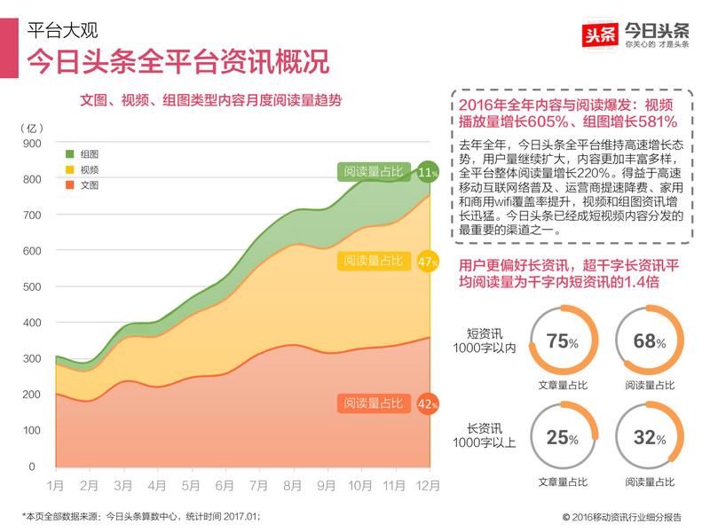 2016年全年内容与阅读爆发,视频播放量增长605%、组图增长581%。去年全年,今日头条全平台维持高速增长态势,用户量继续扩大,内容更加丰富多样,全平台整体阅读量增长220%。得益于高速移动互联网络普及、运营商提速降费、家用和商用wifi覆盖率提升,视频和组图资讯增长迅猛。今日头条已经成短视频内容分发的最重要的渠道之一。