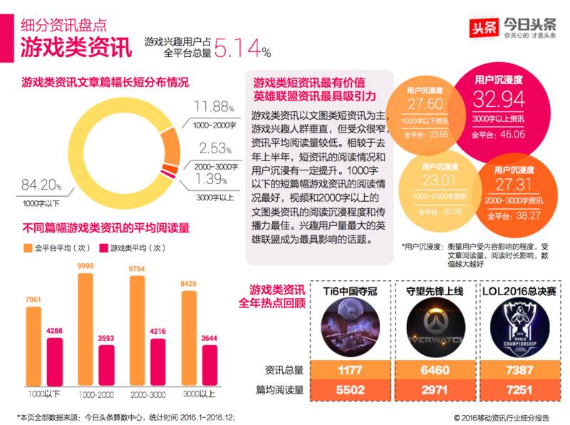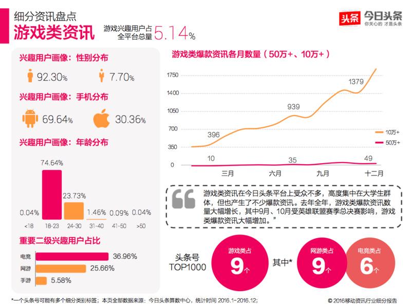 游戏类资讯在今日头条平台上受众不多,高度集中在大学生群体,但也产生了不少爆款资讯。去年全年,游戏类爆款资讯数量大幅增长,其中9月、10月受英雄联盟赛季总决赛影响,游戏类爆款资讯大幅增加。”