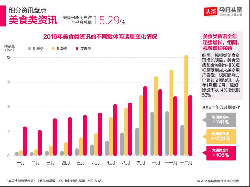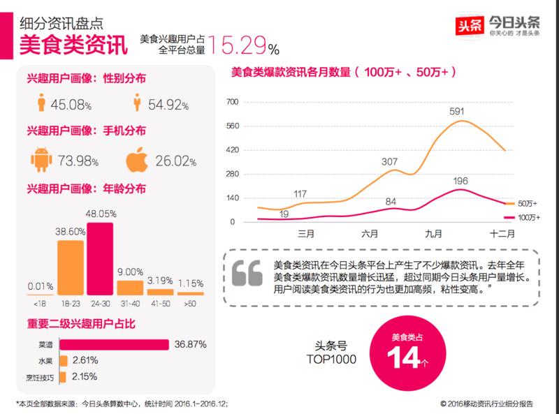 美食类资讯在今日头条平台上产生了不少爆款资讯。去年全年美食类爆款资讯数量增长迅猛,超过同期今日头条用户量增长。用户阅读美食类资讯的行为也更加高频,粘性变高。