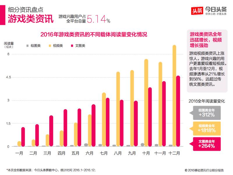 另外,游戏视频类资讯上涨惊人。游戏兴趣的用户更喜爱观看短视频。 去年1月至12月,视频渗透从21%增长 到58%,远超过传统文图类资讯。