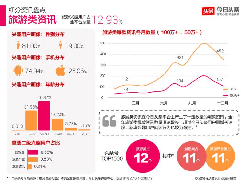 旅游类资讯在今日头条平台上产生了一定数量的爆款资讯。全年旅游类爆款资讯数量迅速增长,超过今日头条用户量增长速度。新增兴趣用户阅读行为也较为稳定。