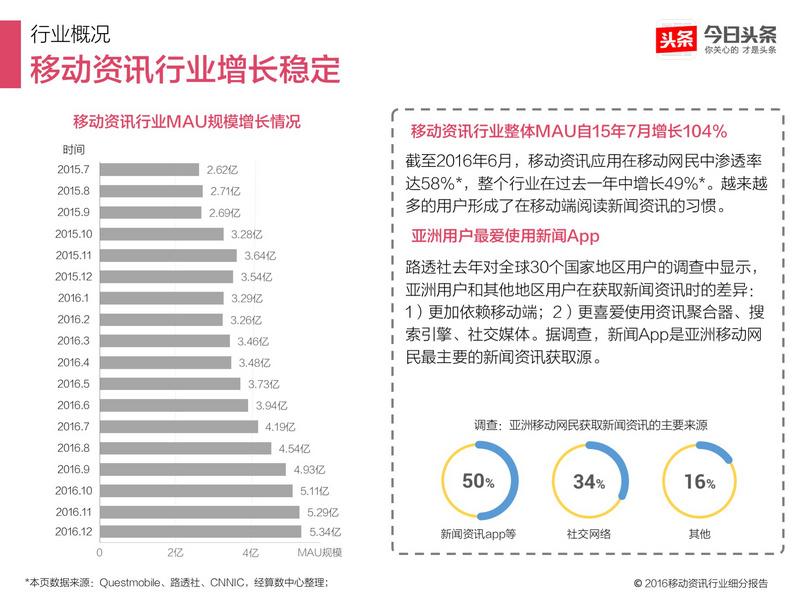 截至2016年6月,移动资讯应用在移动网民中渗透率达58%,整个行业在过去一年中增长49%。越来越多的用户形成了在移动端阅读新闻资讯的习惯。路透社去年对全球30个国家地区用户的调查中显示,亚洲用户和其他地区用户在获取新闻资讯时的差异:1)更加依赖移动端;2)更喜爱使用资讯聚合器、搜索引擎、社交媒体。据调查,新闻App是亚洲移动网民最主要的新闻资讯获取源。