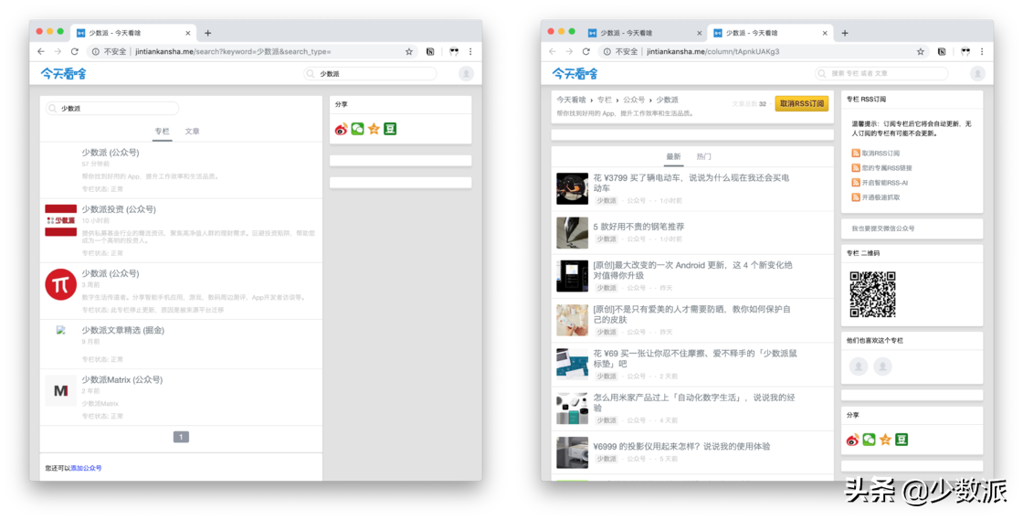 「今天看啥」为几乎每个微信公众号都定制了专属的 RSS 链接,我们登录「今天看啥」之后,直接搜索公众号名称,点击「RSS 订阅」即可直接订阅公众号。之后在我们的关注页面,就能够直接看到我们订阅公众号更新的全部文章。这样,我们就能够直接在电脑网页端查看微信公众号的推送文章,不必费事将微信公众号文章链接再发送到电脑上打开阅读了。