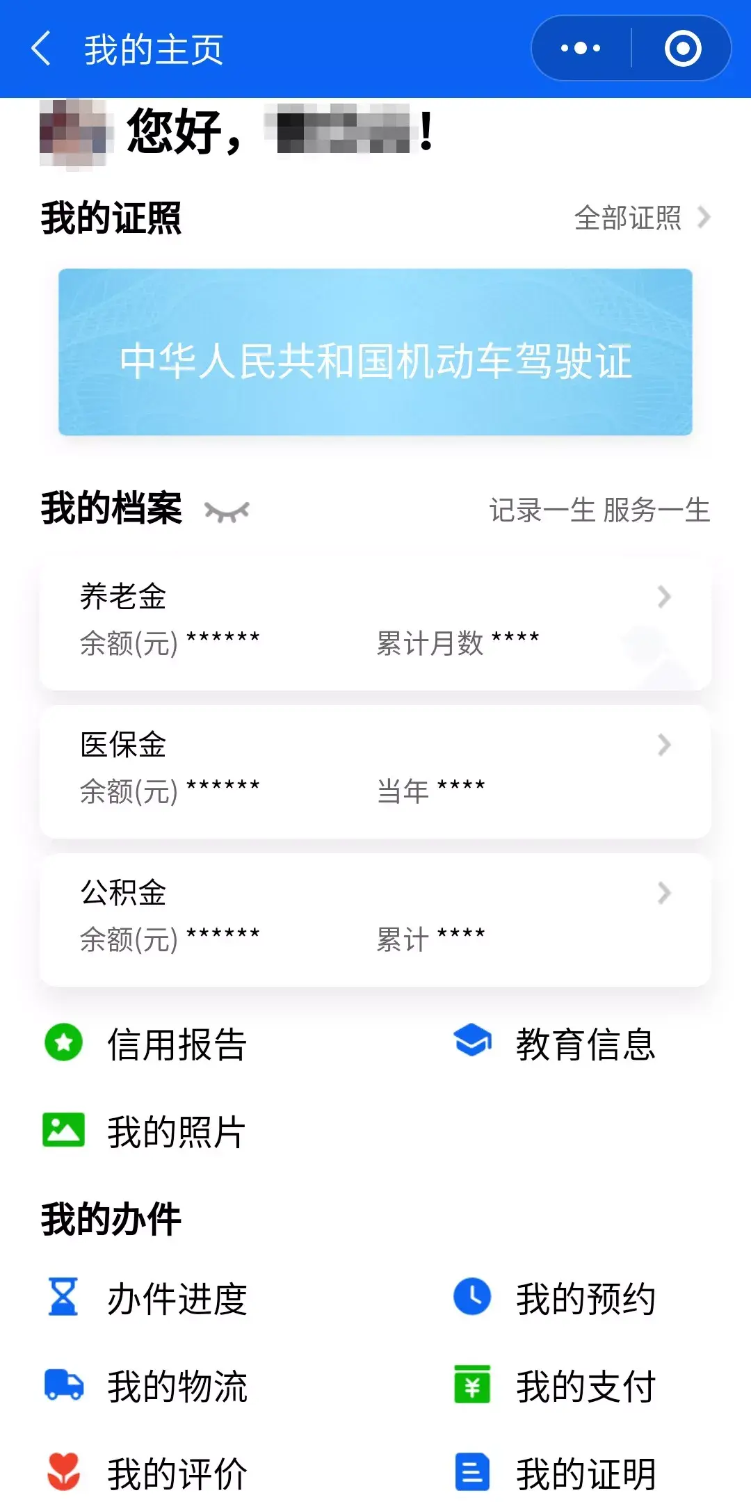 第四步:认证登录完成后,即可在“我的主页”查询电子证照、三金记录、各类证件照片等信息↓