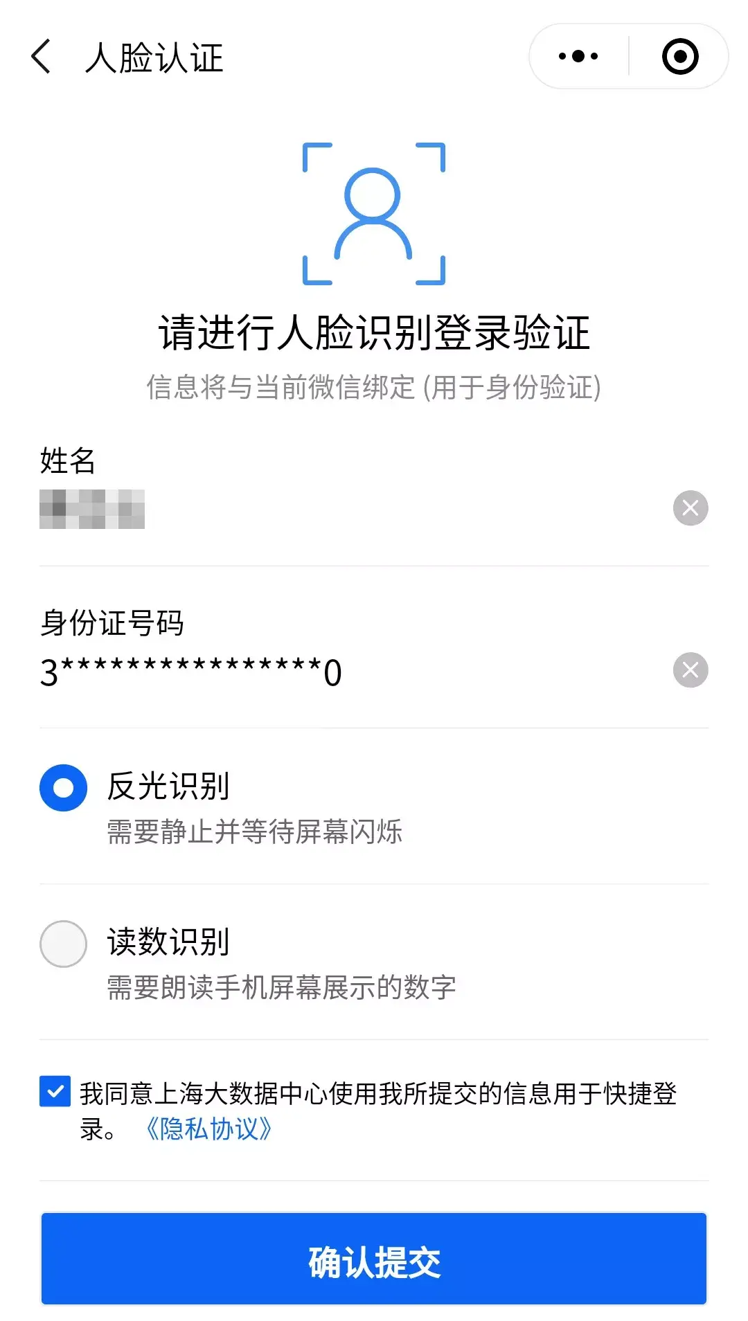 第三步:填写个人姓名和身份证号码,并进行人脸识别↓