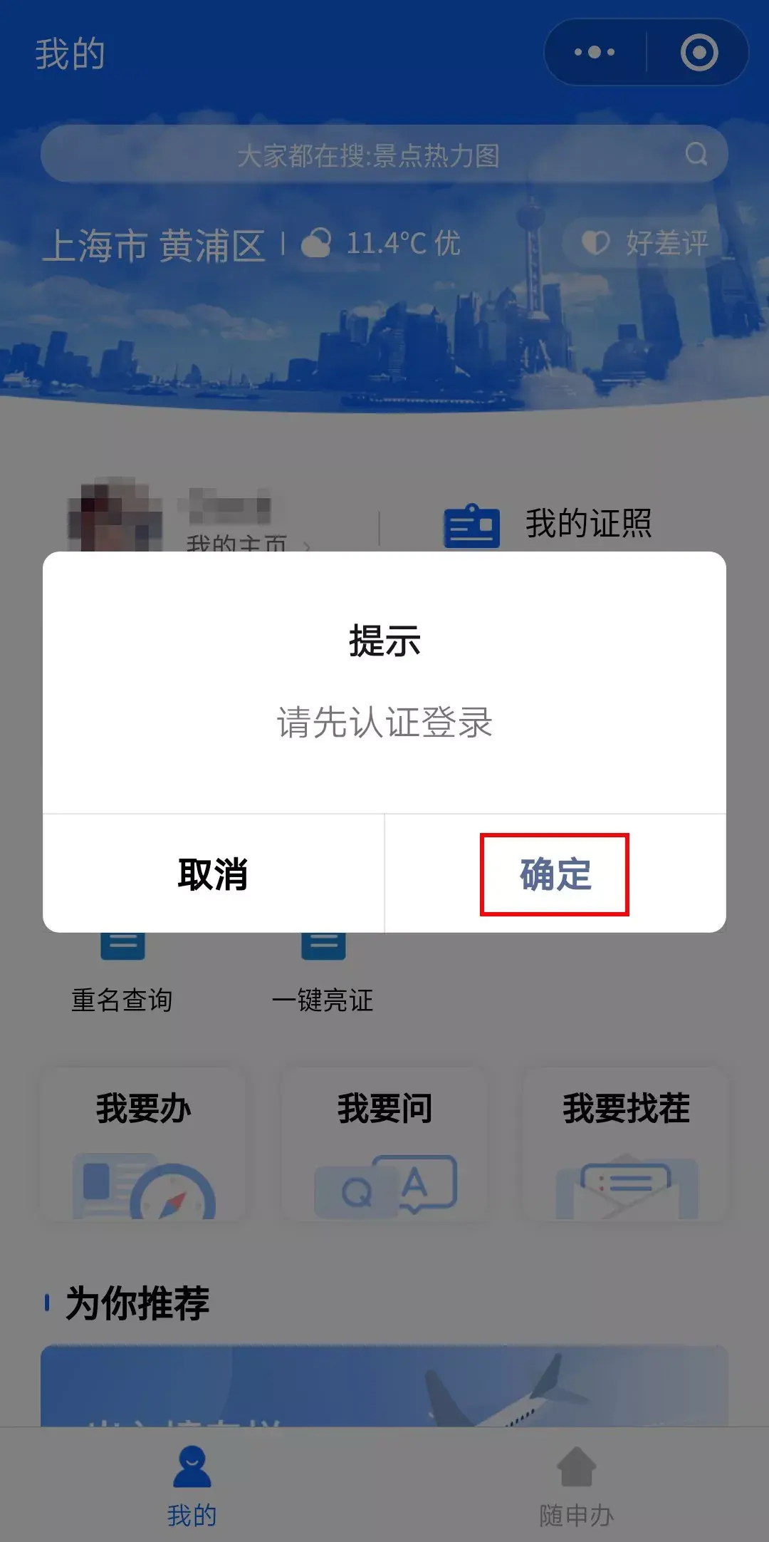 第二步:进入“随申办”,点击“我的主页”,进行认证登录↓