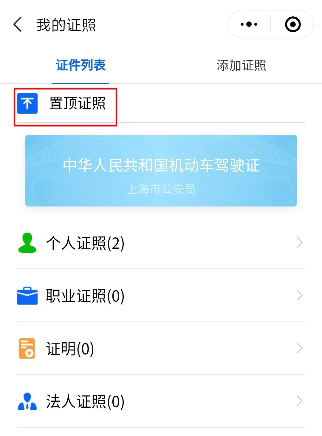 选择“置顶证照”↓