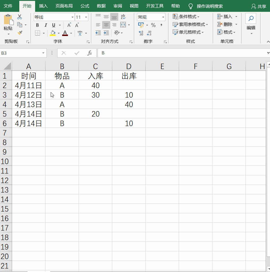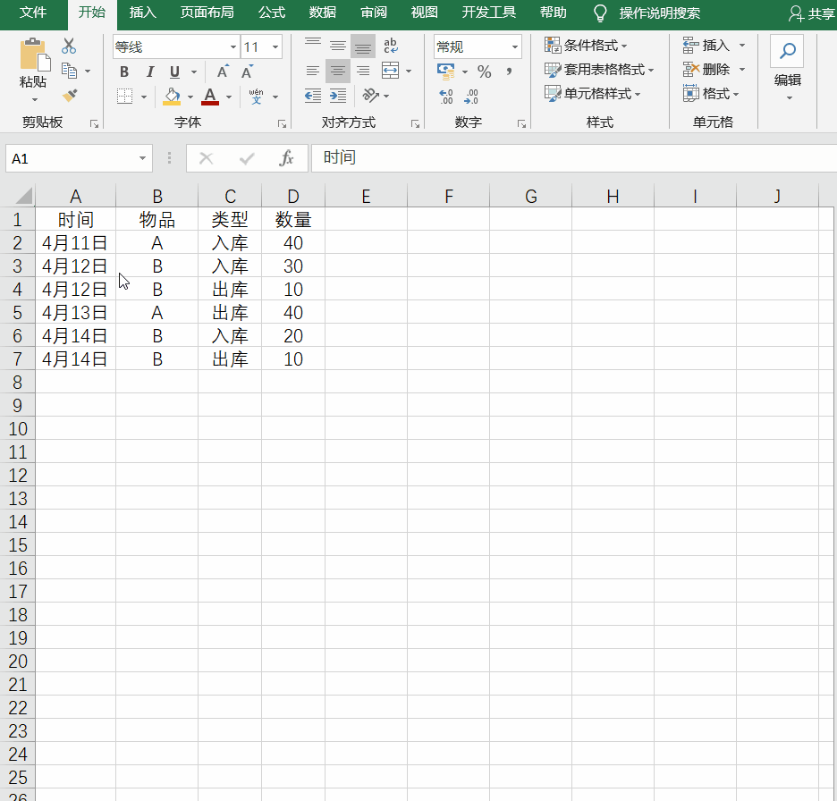 设计的表格如下所示,这种是类型为字段标题,入库还是出库都进行记录,并且记录发生的数量。