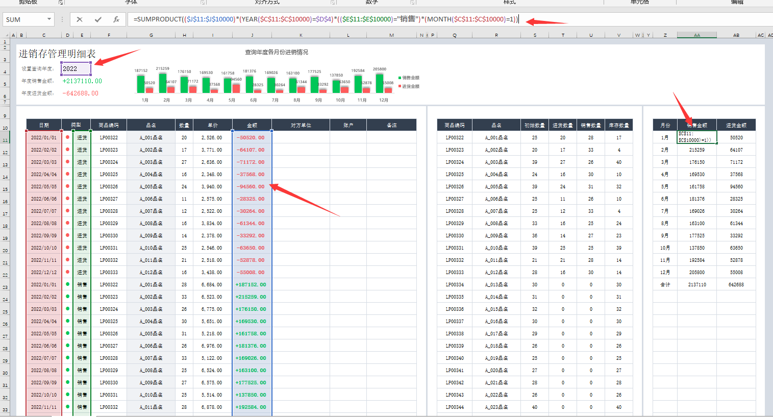 メ表格最右侧,根据日常登记,1-12月每月销售金额,进货金额,根据年份选择,自动统算求和。メ