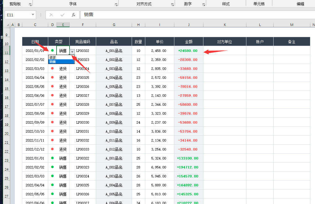 メ日常登记区域,下拉菜单选择销售进货,自动图标变色显示,方便表格操作。メ