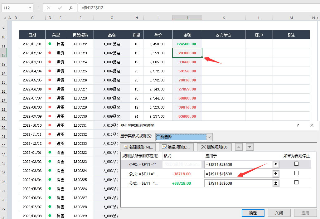 メ表格区域设置条件格式,根据进货销售不同,字体颜色自动变化。メ